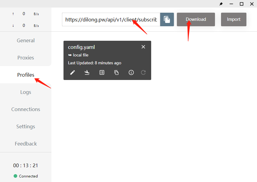 在 Profiles 模块下,您可以导入代理供应商提供的配置文件。点击 “下载配置” 按钮,并粘贴配置文件的下载地址,然后点击 “导入”,Clash for Windows会自动下载并应用该配置。